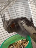 Seems to be nervous around people, not used to being touched or handled. Wings were originally unclipped but we clipped them to prevent it from flying around all over the place.
