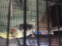 , He has peach cheeks, a yellow top knot and is pied gray and pale yellow. He’s very sweet and friendly.