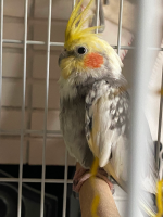Predominantly dark grey cockatiel. Dark nails, dark beak, though it looks like it might actually be a peach-colored beak with a dark smudge on top. Bird does not seem to be tame; very afraid of hands.