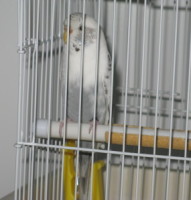 Found in suburb of USA CA, San Jose — Willow Glen. White wings and head. Upper half of chest white. Lower half pale blue. Healthy, alert, active. Uninjured. Has black band on left leg. Safe and being cared for. Has black band on left leg.