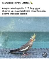 Safe, eating well, has not been out long and is a juvenile. Gray head, muted orange cheeks, gray and yellow head feathers
