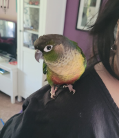 Very friendly, flew right to our shoulder. Is safely in a large cage now with food and water, no apparent injuries. Eating and drinking well.