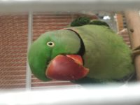 Some friends and I found a male Indian ring-necked parakeet alone outside in the Logan Square neighborhood. He’s in great shape aside from an injured toe that might need to be amputated, according to a vet we saw yesterday. Very sweet.
