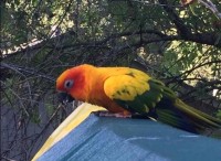 UPDATE I am looking for this bird’s owner. He has a leg band on that reads FA CA 1517. If you know of anyone who is missing their Sun Conure, please have them contact me. I would like to give them his body so they may bury him or cremate him, or have a foot print done..and extend my condolences.