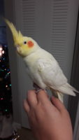 Very sweet Lutino Cockatiel found outside. Will step up when prompted and is very social. Owner to provide band number.