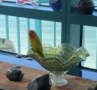 This flighted lovebird flew into my mother’s apartment and it being held for safekeeping. In Sand Key, Florida near Bay Park.