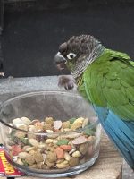 Very happy to see people! Found on top of pool screen cage. It came to me when I called for it. This photo does not show its beautiful red tail.