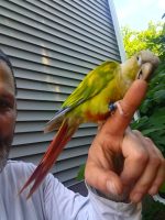 Found in Little Ferry NJ on June 14 BLUE banded Green Cheek Conure ..she was sweet social nice red tail..