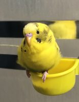 FOUND a very friendly parakeet in my NJ back yard soaking up the sun. Mostly yellow with some green underneath. Easy to handle and not afraid of people. Loves to chirp and sing… a lot. There is a band on its leg.