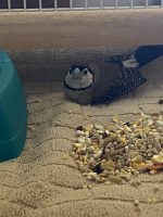 Found Owl Finch in La Mesa, California on Cowles Mtn. Boulevard. It appears to have an injured wing. It has a band on one leg.