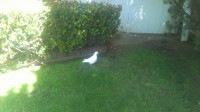 Appeared in our neighborhood (near Sepulveda and Mulholland) a few days ago. Appears to be tame with clipped wings. Somewhat shy.