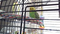 This baby budgie has green body and black feathers. Wings not clipped. Banded. Found in 7 Oaks community of Rancho Bernardo.