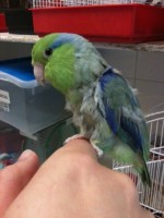 Have a lost Parrotlet surrendered to our pet store by the people that found it. Have very little information to go on, but it was probably somewhere around Country Hills or some other community with a short driving distance. The bird is quite tame; he likes to stay close by and especially loves scratches, though he can be pretty nippy. His chest is downy due to overpreening/plucking. He’s also got a chipped beak, though this may be due to his time outside. Had full flight, but I clipped his wings for safety.