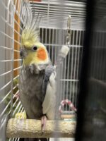 male grey cockatiel with yellow face and orange cheek spots. Does not seem to use words or special whistles. feisty/bitey.