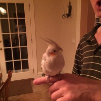 Very sweet bird and affectionate. Mostly grey, with a spot of yellow on the top of its head. White streaks on wings