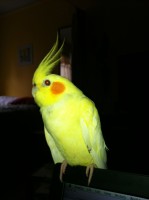 Yellow and white feathers, orange cheek patches. Please email with an existing photo or distinguishing features to identify if you think she might be yours.