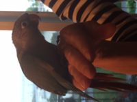 Very friendly green Conure flew into my high-rise balcony on the evening of 6/15. Very friendly & comfortable with people.