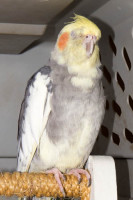 Cockatiel found downtown Chicago this morning, April 14, 2015. Gray, yellow, white.