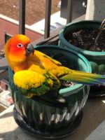I found it sitting in a flower pot on my 12th-floor balcony in Chicago (Old Town/Gold Coast neighborhood). It is very tame and friendly; it flew onto my shoulder right away and will perch on my finger when I put out my hand. It was thirsty and quite hungry, so I’m not sure how long it has been out lost. His feathers and wings appear in good condition. It is not banded. I contacted the vet offices nearby and the one that does take care of exotic pets has not seen this bird before, so I’m not certain he lives in this area. I’m not very familiar with parrots so I don’t know how far they can fly. I have a wonderful neighbor who keeps birds and is helping me with the search and also with housing the parrot so that it is safe and cared for until we can locate the owner.