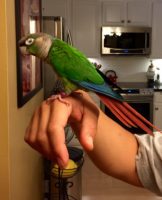 The Parrot walked in my house through the doggie door on Saturday night. This is an extremely friendly. That is missing his owner please help me find his way home .