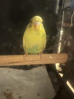 This budgie was lost with another budgie (normal blue). Both are babies and because their wings are clipped and they have no bands, I assume they were very very recently bought from a pet store like Petco/Petsmart. Only was able to catch the yellow recessive pied budgie (normal blue still lost).