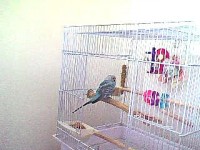 Found Parakeet is green, blue, gray, and white. He is very friendly.