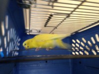 Bird is about 6″ tall, mostly yellow with a green patch on its back.