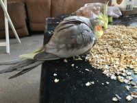 Gray with yellow head and flight wings. Banded. Friendly. Easily hopes on your finger. Being well cared for. We picked him/her up in our search for our missing cockatiel Echo.