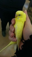 Pure Yellow Parakeet. Did not see any bands. Was found cold and somewhat skinny.