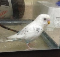 Mostly White Budgerigor (Budgie) with some Blue and Black markings. Cere is light in color, may be a young bird.