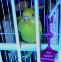 its yellow its a parakeet has a bracelet that says (band number on file with 911 PA). its scared of being touched or near you by a couple of inches its silent and it nibbles on my finger when i pet him or her or when i am cleaning its cage.