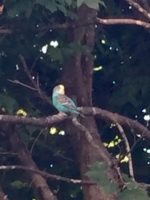 Turquoise-blue with yellow face budgie is hanging out with the wild birds in our yard–flies well, but also pauses to listen to us. Haven’t been able to catch him, but we’re working on it.