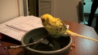 Found parakeet in apartments near Tanglewilde/Gessner/Westheimer in Houston. Bird is a bright yellow, with a little green. I approached the bird and he easily let me pick him up. I brought him inside last night, and bought him bird seed. I have a fake cage made up of a cardboard box with sticks. He hasn’t eaten anything yet, and mostly has been sleeping.
