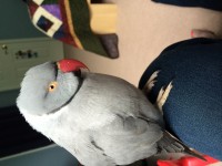 This beautiful bird was found in Kent, Washington on May 6 at approximately 1:00 pm. He was found in the Kent/Covington/Fairwood area at 240th and 148th. He is a grey Indian Ringneck Parrot that has a red beak and a black ring around his neck that fades into a white ring on the top of the neck. I suspect that “he” is a male, in his late juvenile years. He is very friendly, obviously handled a lot, and he was quite hungry when we found him.