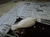 I found this White Homing Pigeon lying in the gutter on Reseda Boulevard between Roscoe and Chase. This beautiful bird was either hit by a car or dragged by a car as she had oil on her head and left wing. She/he also lost her left leg (clean cut from the breast) from this accident. She/he had a band on her left leg but the ID of the band is missing (only upper and lower portion is present) and without that information, I can not trace the owner. On a positive note, she/he is no longer bleeding, has been resting indoors and has a great appetite. If I can not find the owner, I do have a gentleman who does White Dove Release which is looking to adopt he/she and care for he/she.