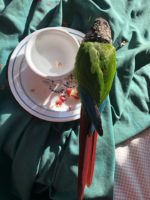 Bird appears to be uninjured and was eating and drinking normally and acting very friendly. It was found by a fellow volunteer for our Humane Society. Since vet offices were closed and our local Animal Control couldn’t take the bird, we found a woman who has raised parrots for 20 years (she showed pictures of her set-up and looked legit). If this is your bird, please be ready to state the band color and ID. Band SP- CA- xxxx.
