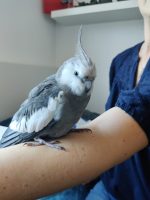 Grey cockatiel, very friendly, band on its leg.