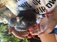 Very nice. Grey with blue & purple around neck. Sitting in my garden not scared but hungry. Yellow eyes.