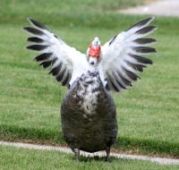 It is a Muscovy Duck he has been seen in this area for days now but he has been sleeping and eating on one of the streets in this area He is grey and white with red face he is very friendly so he has to be a pet. I am worried he will get hit by a car or eaten by a fox. if it is your duck please let me know and we can try and help you get him