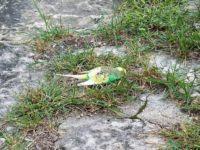 Green, yellow and white parakeet found in neighborhood backyard on N. Eastern Ave in Bartlett, Illinois on September 14, 2018 around dinner time. Bird is NOT injured and flying and landing in nearby trees. Can’t tell if there’s a band on one of its legs. There’s a bird bath with water in the backyard so bird has access to water. Appears healthy.