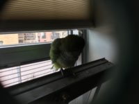 Flies well. Wings not clipped. Docile. Allows holding and petting. Mostly green. Found flying around alley between Montrose and Kenmore at Broadway in Chicago