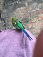 Green, blue, and yellow bird (parakeet?) found in West Ridge neighborhood of Chicago by my neighbor. The bird was calling outside and responded to a whistle. Once my neighbor whistled, the bird joined him on his back porch and sat on his arm and head. The bird repeatedly tried to fly indoors. Unfortunately, the bird has since flown off. They most certainly have a home they’re missing!