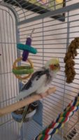 Found cockatiel with white and gray body with yellow head and orange cheeks.
