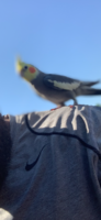 yellow with orange spot. grey body and yellow tips on feathers. friendly and banded