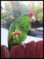 We found a Red Crowned Amazon Parrot a couple days ago, tired and confused-looking, in our backyard, in Highland Park.