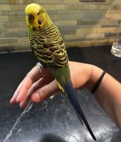 Found near Albemarle Rd and Crafts St intersection, Newton, MA. Male, very hand tame and friendly. Green body, yellow face, yellow and black wings and back, blue tail. He likes to be scratched on his cheek. Found as a good flier, several primary feathers appeared to have been cut but grown back in. Please contact if you think he might be yours!