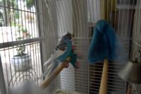 Went into open bird cage with strategically placed food. Bird was flying wild and landed in my neighbors yard. Has right wing that it holds up slightly when perched, but did fly.