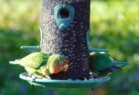 I first discovered the birds at my feeder. I think these are Fischer lovebirds or a combination of peachface and Fischer. They look very much alike except one of them has a dirty white band of feathers around its neck. The other has a few of these feathers but not as many. They would come either together or separately. Lovely little birds. They chirp loud and squeaky and love to communicate, but will not let me get close except for one time. When I hear their chirp, I have been adding lovebird food to my feeder. They come throughout the day and eat heartily. They look a little rugged from being outdoors, but beautiful. We have many cats and chicken hawks in the area and I fear for them. They seem like they have adjusted to the outdoors….they eat with the other birds and squirrels, but I fear for their safety with the weather and predators. No bands.