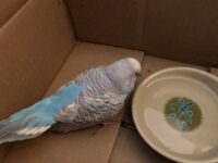 The budgie is blue with faded black/white stripping on the top. I beleive he is male, as his cere is blueish, and I think he’s fully mature. He is anded and seems used to being around people. He was found at Solana Apartment complex at the bottom of the stairs to our building and was very overheated.