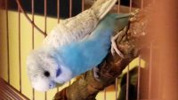 Adult blue parakeet with white on its head, found in East Meadow at the corner of Newbridge and Hempstead Turnpike.